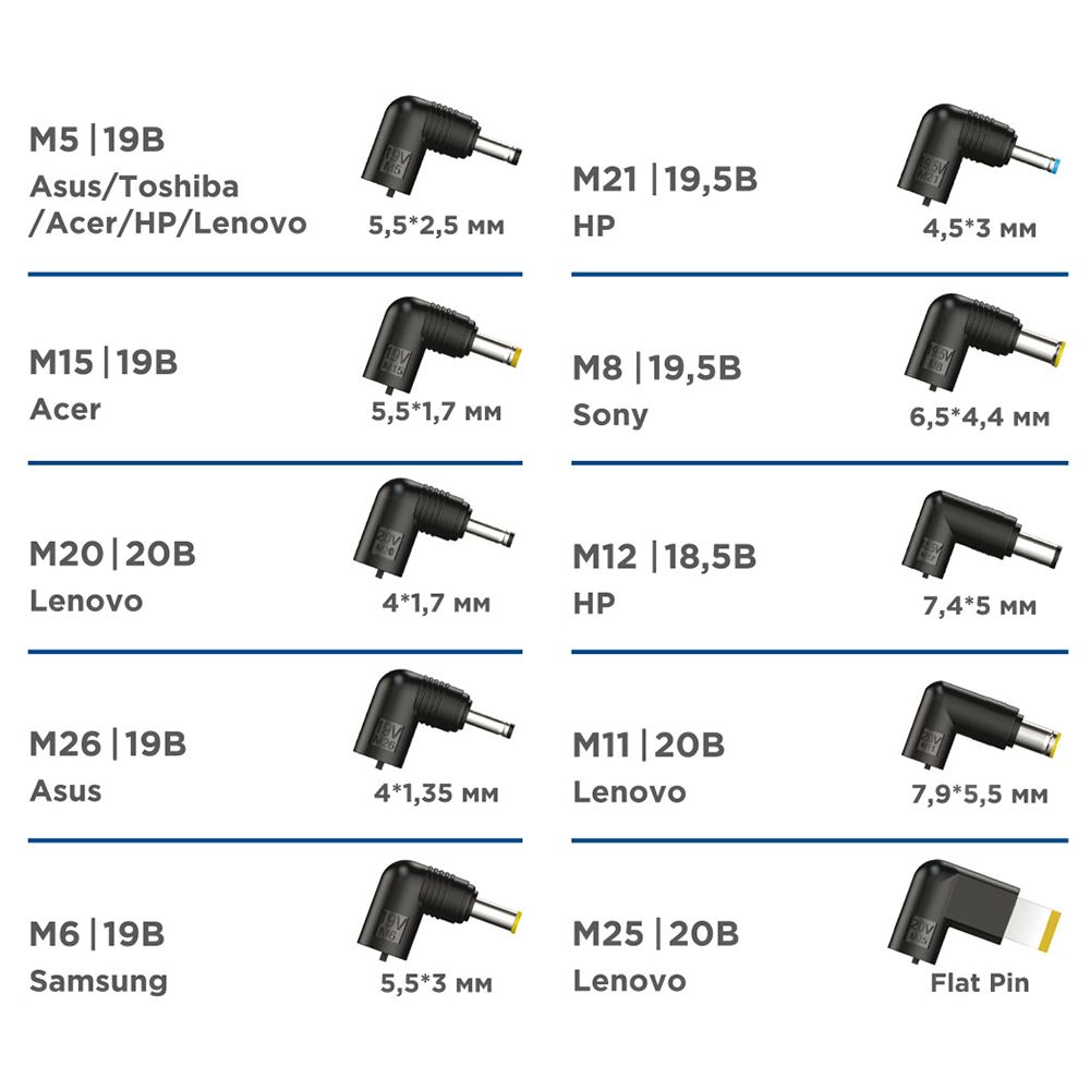 Производитель: Gembird Наименование: Универсальный автоматический блок питания для ноутбуков Входное напряжение: 100 - 240 В , 50 / 60 Гц Выходное напряжение: 18.5 - 20 В Сила тока: 3.42 А Макс. Выходная мощность: 65 Вт (макс.) Защита от короткого замыкания: есть Защита от превышения выходного напряжения: есть Защита от перегрузки по току: есть Защита от перегрева: есть Длина кабеля: 1.5 м (C5) + 1.4 м (встроенный) Материал корпуса: Пластик Цвет: Черный Вес с упаковкой: 530 г Комплектация