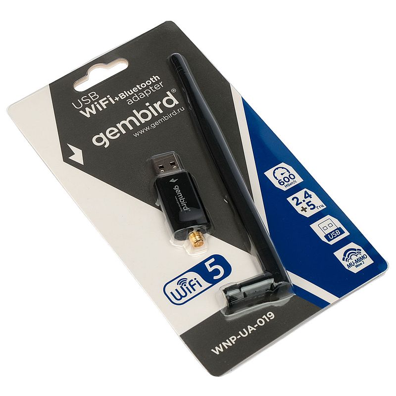 Gembird WNP-UA-019 - двухдиапазонный WiFi-адаптер с внешней антенной и Bluetooth 4.2. Обеспечивает подключение к сети WiFi на частоте 2.4 ГГц и 5 ГГц, а также позволяет подключать периферийные Bluetooth устройства. Поддерживает технологии MU-MIMO. Скорость передачи данных до 600 Мбит/с.