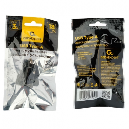 оснащен портом USB-A. Максимальная мощность - 18 Вт. Корпус зарядного устройства выполнен из ударопрочного пластика и имеет