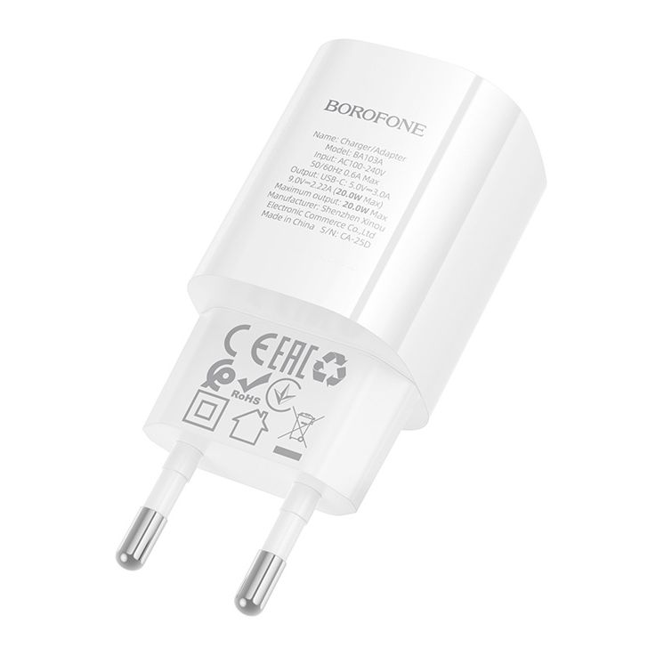 Borofone BA103A - сетевое зарядное устройство с поддержкой стандартов быстрой зарядки PD, QC3.0/2.0, FCP, AFC. Адаптер обладает мощностью 20 Вт и оснащен портом USB-С. Многоуровневая защита от короткого замыкания, перенапряжения, скачков напряжения, перегрева и перезаряда помогает обезопасить подключенные устройства от поломки. Корпус выполнен из термостойкого и ударопрочного пластика.