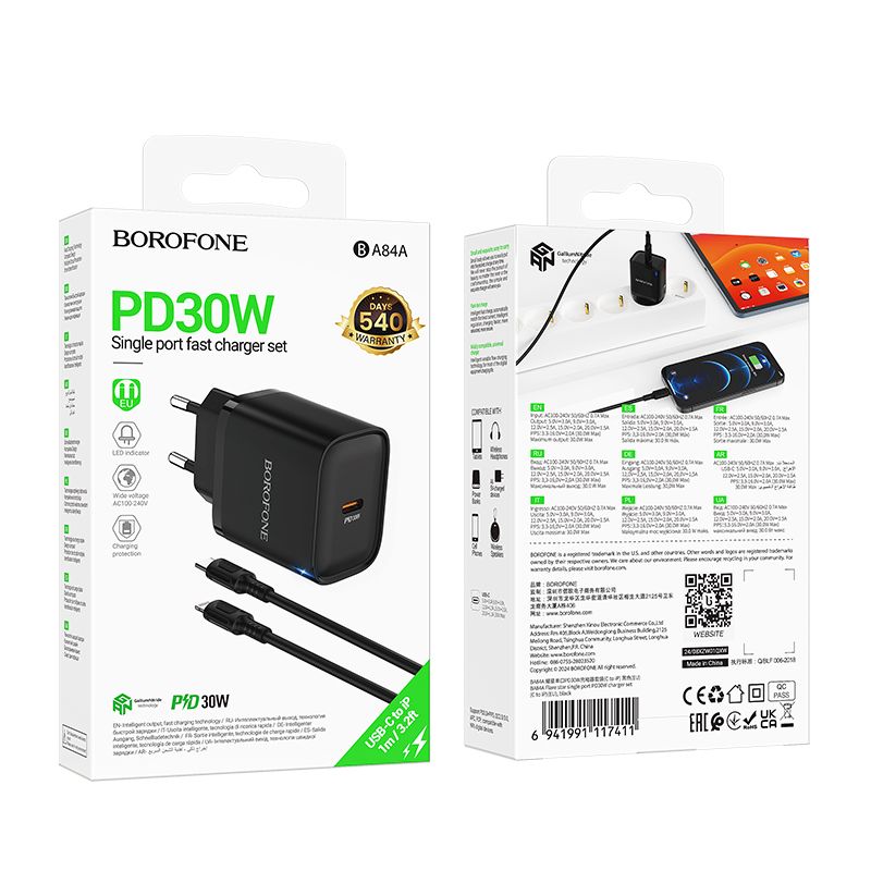 Borofone BA84A - сетевое зарядное устройство с поддержкой стандартов быстрой зарядки PD 30W, QC3.0/2.0, FCP, AFC. Адаптер обладает мощностью 30 Вт и оснащен портом USB-С. Корпус выполнен из термостойкого и ударопрочного пластика. В комплект входит кабель Type C - Lightning длиной 1 метр.