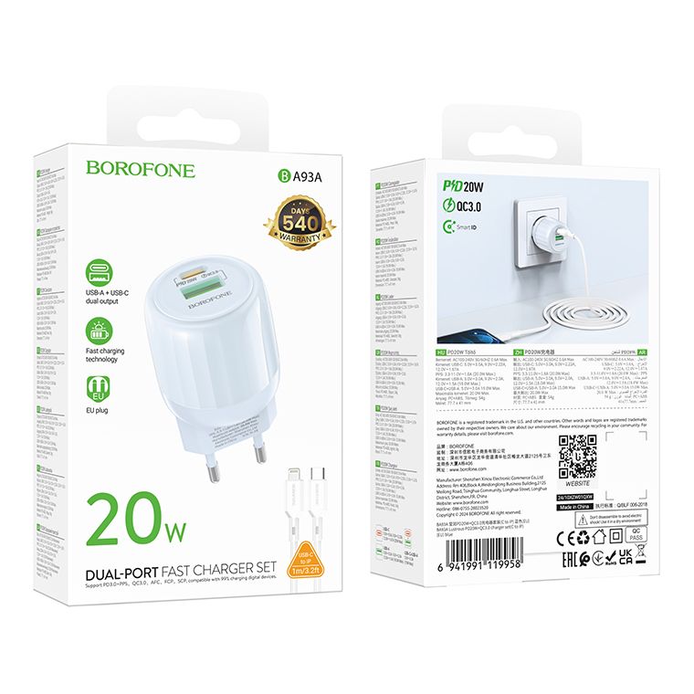 Производитель: Borofone Наименование: Сетевое зарядное устройство Входное напряжение: 100-240В, 50/60 Гц Выходное напряжение: 5-12В Максимальная выходная мощность: 20 Вт Максимальный ток: 3А Поддержка быстрой зарядки: PD, QC 3.0/2.0, Huawei FCP, Samsung AFC Кол-во USB-портов: 1xUSB A, 1xUSB C Материал корпуса: Термостойкий ударопрочный пластик Цвет: Синий