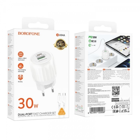 Borofone BA94A Lustrous - сетевое зарядное устройство с поддержкой стандартов быстрой зарядки PD, QC3.0/2.0, FCP, AFC. Адаптер обладает мощностью 30 Вт и оснащен двумя портами: USB-A и USB-С. Многоуровневая защита от короткого замыкания, перенапряжения, скачков напряжения, перегрева и перезаряда помогает обезопасить подключенные устройства от поломки. Borofone BA94A Lustrous выполнен в корпусе из термостойкого и ударопрочного пластика. В комплект входит кабель Type C - Lightning длиной 1 метр.