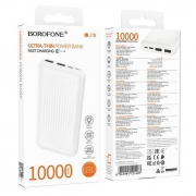Производитель: Borofone Наименование: Портативное зарядное устройство Емкость: 10000 мАч Тип аккумуляторов: Li-pol Входное напряжение: 5 В /2 A Выходное напряжение: 5 В /2 А Максимальный выходной ток: 2 A Входные порты: Micro USB, USB C Выходные порты: 2 x USB A Индикация: LED Цвет: Белый Материал корпуса: Термостойкий ударопрочный пластик Размеры: 146 x 68 x 17 мм Вес: 225 г