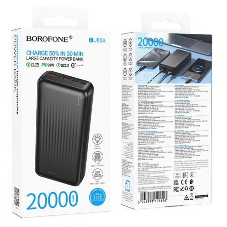 Внешний аккумулятор Borofone BJ80A Clever с поддержкой стандартов быстрой зарядки PD 20W, QС3.0/2.0, FCP, AFC, SCP. Устройство оснащено литий-полимерной батареей емкостью 20000 мАч, двумя выходными портами USB-A и портом USB-C. Для зарядки повербанка используется вход Type C или Micro USB, поддерживающие быструю зарядку. Контроль за уровнем заряда аккумулятора осуществляется с помощью светодиодного индикатора. Технические характеристики