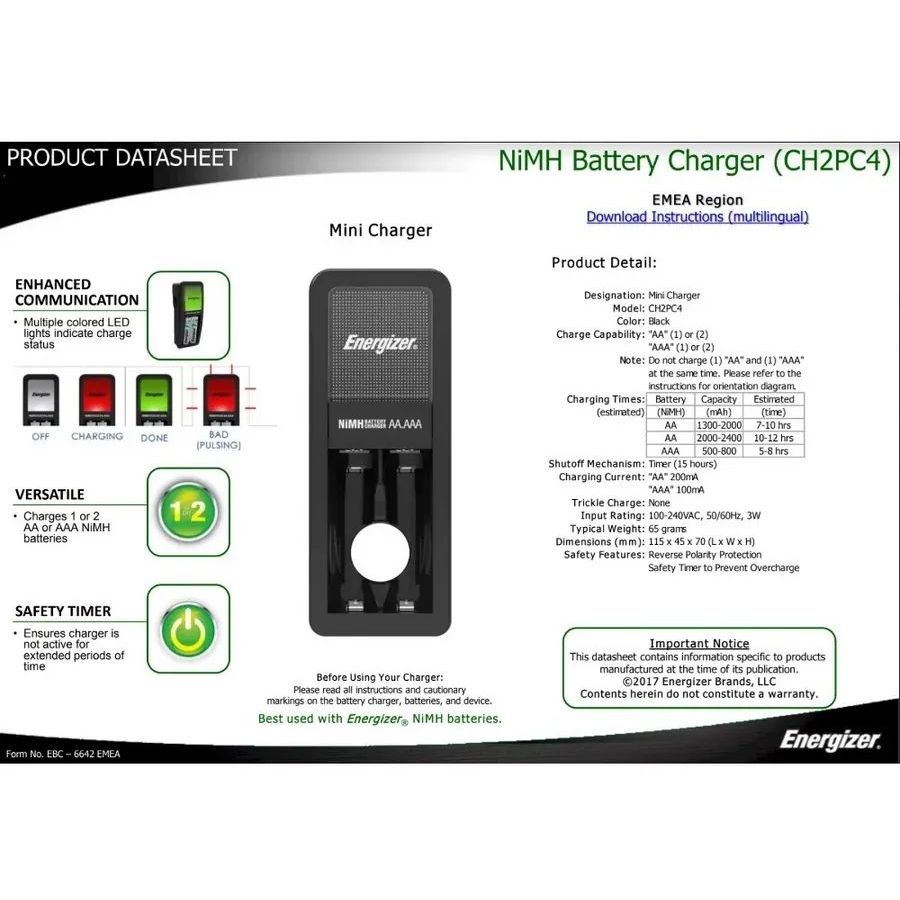 Energizer Mini Charger - ультракомпактное зарядное устройство для аккумуляторов AA и AAA. Устройство оснащено световым индикатором состояния заряда и функцией автоотключения. Безопасная зарядка аккумуляторов AA и AAA за 5-12 часов. Работает от электросети. В комплект входят 2 аккумулятора AA 2000 мАч.