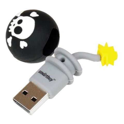 Оригинальный USB-накопитель SmartBuy Bomb прекрасно подойдет пользователям с отменным чувством юмора. Корпус устройства выполнен из ударопрочной резины и оснащен съемным колпачком, предохраняющим разъем от влаги, пыли и загрязнений. Эта забавная флешка отлично дополнит связку ключей, послужит симпатичной подвеской на сумке или станет приятным презентом другу.