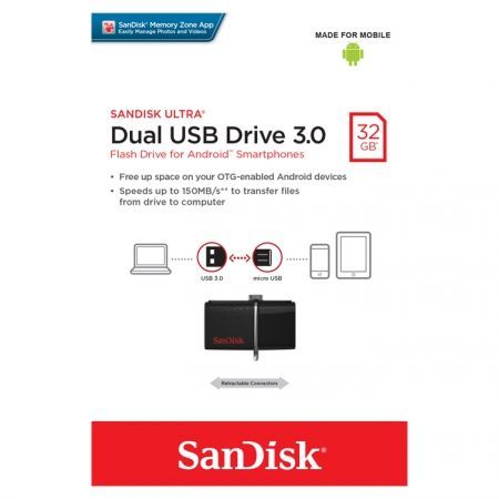 Уникальный USB-накопитель Sandisk Ultra Dual 3.0, оснащенный разъемами USB и microUSB, значительно упрощает передачу файлов с портативных Android-устройств на компьютер. Модель оборудована технологией Plug and Play и автоматически определяется при подключении к смартфону или планшету Android с поддержкой режима OTG (On The Go). Благодаря высокоскоростному интерфейсу USB 3.0 обеспечивается моментальная передача данных со скоростью до 150 Мб/сек. Выдвижной механизм позволяет легко воспользоваться одним из двух разъемов или убрать их в корпус, когда они не нужны. Компактный элегантный корпус и оригинальное металлическое ушко дают возможность носить флешку с собой на связке ключей или ленте. Пользователям накопителя доступно ПО SanDisk Memory Zone, позволяющее эффективно управлять файлами, хранящимися на мобильном устройстве, упорядочивать их и создавать резервные копии.