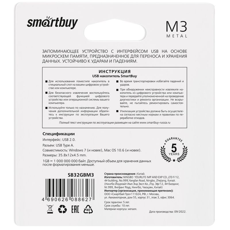 32Gb Smartbuy M3, металл, USB 2.0 (SB32GBM3)