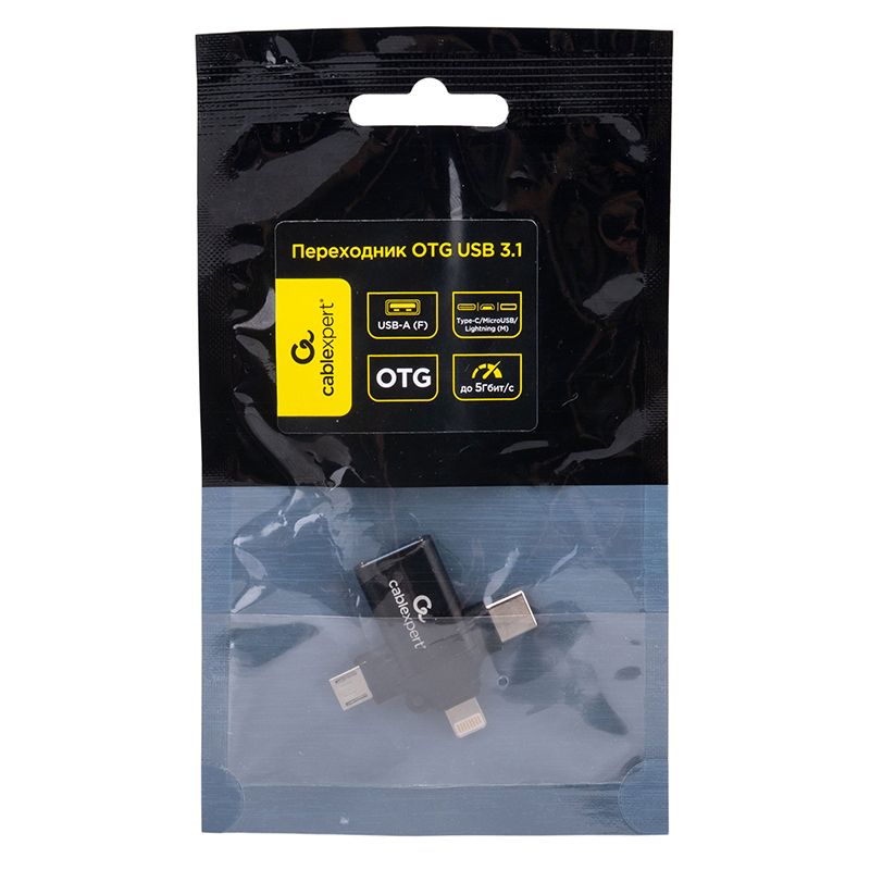 Производитель: Cablexpert Наименование: Адаптер USB OTG Интерфейс: USB 3.1 Скорость передачи данных: до 5 Гбит/с (Type C) Максимальный ток: 1 A Разъемы: USB Af - Micro USB Bm + Type Cm + Lightning Цвет: Черный