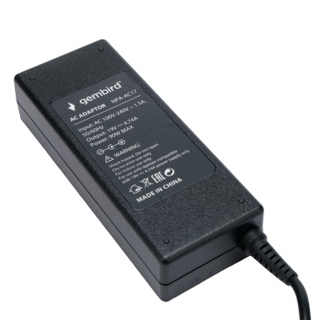 Производитель: Gembird Наименование: Блок питания для ноутбука Совместимость: Asus, Toshiba Входное напряжение: 100 - 240 В , 50 / 60 Гц Выходное напряжение: 19 В Выходная мощность: 90 Вт Сила тока: 4.74 А Макс. Дополнительно: Защита от короткого замыкания, перегрева, перенапряжения и перегрузки Штекер: 5.5х2.5 мм (угловой) Длина кабеля: 1.5 м (C5) + 1.4 м (встроенный) Материал корпуса: Пластик Цвет: Черный