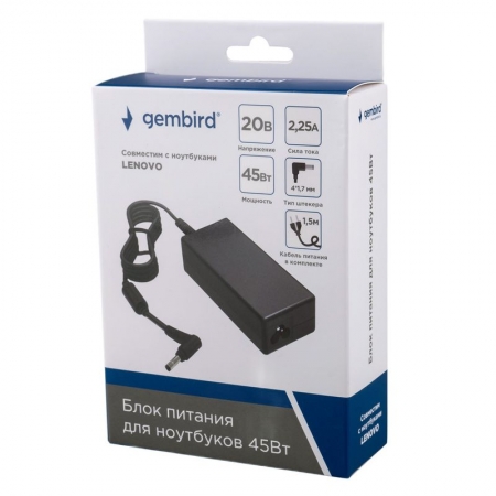 Производитель: Gembird Наименование: Блок питания для ноутбука Совместимость: LENOVO Входное напряжение: 100 - 240 В , 50 / 60 Гц Выходное напряжение: 20 В Выходная мощность: 45 Вт Сила тока: 2.25 А Макс. Дополнительно: Защита от короткого замыкания, перегрева, перенапряжения и перегрузки Штекер: 4х1,7мм (угловой) Длина кабеля: 1.5 м (C5) + 1.4 м (встроенный) Материал корпуса: Пластик Цвет: Черный