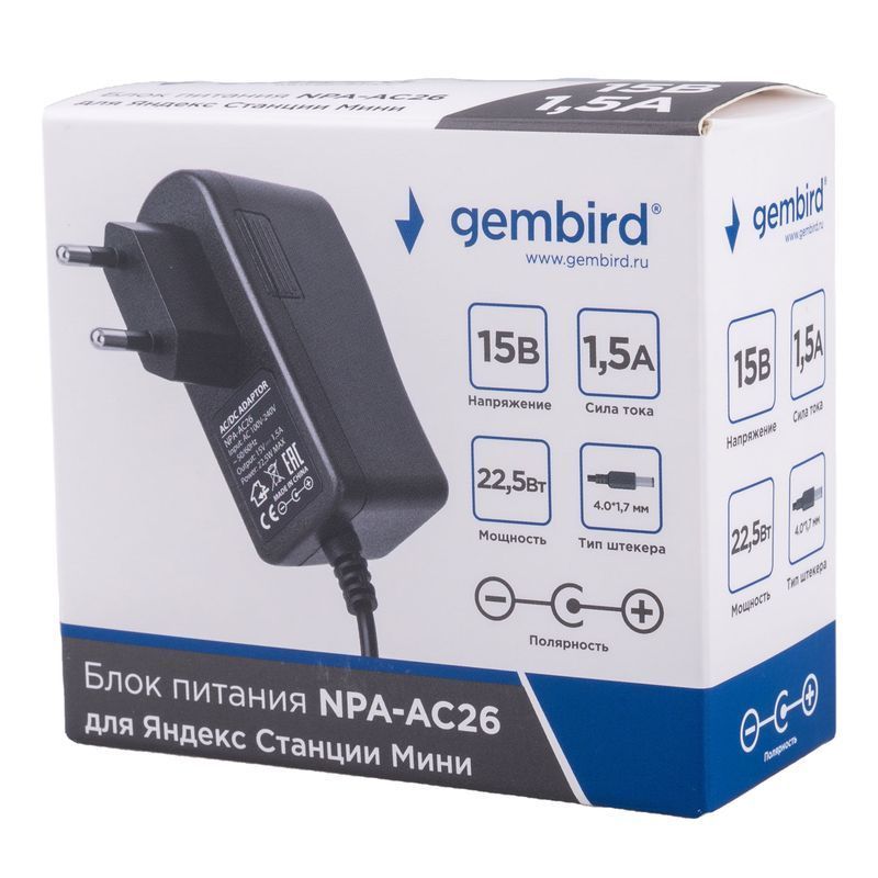 Сетевой адаптер питания Gembird NPA-AC26 для Яндекс станции Мини, также подходит для питания других устройств с входным напряжением 15 В и максимальной потребляемой мощностью 22.5 Вт. Устройство имеет защиту от короткого замыкания, превышения выходного напряжения, перегрузки по току, перегрева. Блок питания оснащен встроенным кабелем длиной 1,8 метра и штекером 4x1,7 мм.