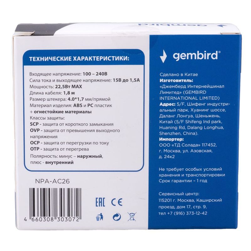 Производитель: Gembird Наименование: Адаптер питания Входящее напряжение: 100 - 240 В Выходящее напряжение: 15 В Сила тока: до 1.5 А Максимальная мощность: 22.5 Вт Размер штекера: 4x1,7 мм Защита от короткого замыкания: есть Защита от превышения выходного напряжения: есть Защита от перегрузки по току: есть Защита от перегрева: есть Полярность: минус - наружный, плюс - внутренний Длина кабеля: 1 метр Вес: 140 г