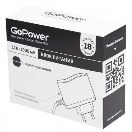Импульсный стабилизированный блок питания GoPower 12В 1А. Адаптер имеет компактный корпус эргономичной формы. Оснащен кабелем длиной 1.2 м и штекером 5.5 х 2.5/12 мм. Полярность положительная (плюс в центре).