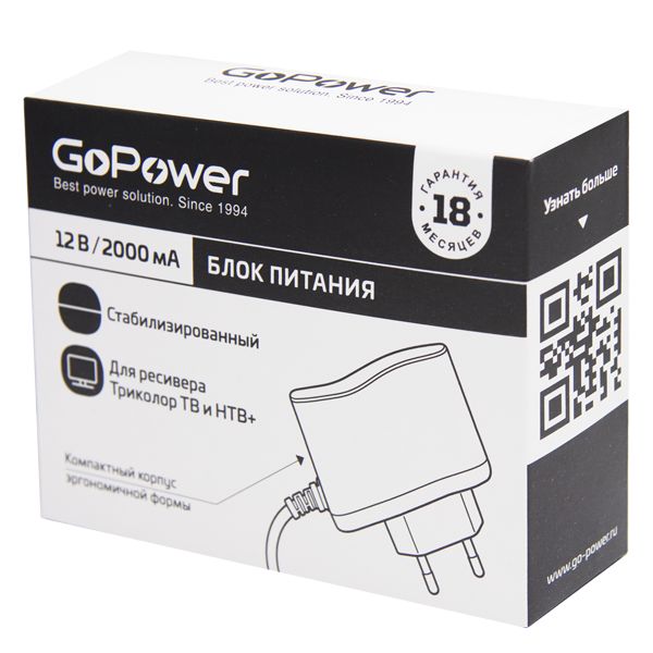 Адаптер питания GoPower 12В/2А для ресиверов Триколор ТВ и НТВ+, штекер 5,5х2,1/12мм (+)