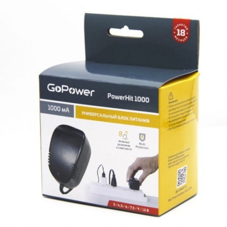 Универсальный нестабилизированный блок питания GoPower серии PowerHit 1000. Устройство выполнено в компактном корпусе, оснащено встроенным переключателем напряжения (3/ 4,5/ 5/ 6/ 7,5/ 9/ 12 В) и имеет выходной ток 1000 мА. Блок питания использует трансформаторную схему, в нем предусмотрена защита от короткого замыкания и перегрузок. Благодаря набору из 8 наиболее распространенных входных разъемов и выбору полярности блок питания совместим с большим количеством современных электроприборов и устройств. Универсальные блоки питания GoPower сочетают в себе современные технологии и продуманный дизайн, и позволяют подобрать решение, идеально подходящее для питания вашего электроприбора.