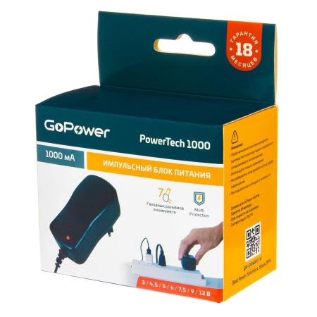 Универсальный импульсный блок питания GoPower серии PowerTech 1000. Устройство выполнено в легком и компактном корпусе, оснащено встроенным переключателем напряжения (3/ 4,5/ 5/ 6/ 7,5/ 9/ 12 В) и имеет выходной ток 1000 мА. Блок питания обладает высоким КПД, сниженным энергопотреблением и отсутствием потерь электроэнергии в режиме ожидания. В нем предусмотрена защита от от короткого замыкания и перегрузок. Благодаря набору из 7 наиболее распространенных входных разъемов и выбору полярности блок питания совместим с большим количеством современных электроприборов и устройств. Универсальные блоки питания GoPower сочетают в себе современные технологии и продуманный дизайн, и позволяют подобрать решение, идеально подходящее для питания вашего электроприбора.