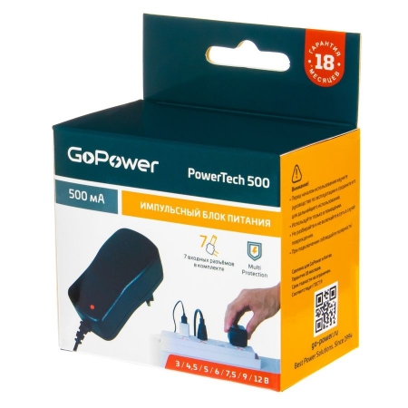 Универсальный импульсный блок питания GoPower серии PowerTech 500. Устройство выполнено в легком и компактном корпусе, оснащено встроенным переключателем напряжения (3/ 4,5/ 5/ 6/ 7,5/ 9/ 12 В) и имеет выходной ток 500 мА. Блок питания обладает высоким КПД, сниженным энергопотреблением и отсутствием потерь электроэнергии в режиме ожидания. В нем предусмотрена защита от от короткого замыкания и перегрузок. Благодаря набору из 7 наиболее распространенных входных разъемов и выбору полярности блок питания совместим с большим количеством современных электроприборов и устройств. Универсальные блоки питания GoPower сочетают в себе современные технологии и продуманный дизайн, и позволяют подобрать решение, идеально подходящее для питания вашего электроприбора.
