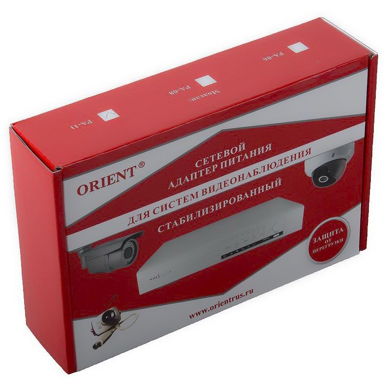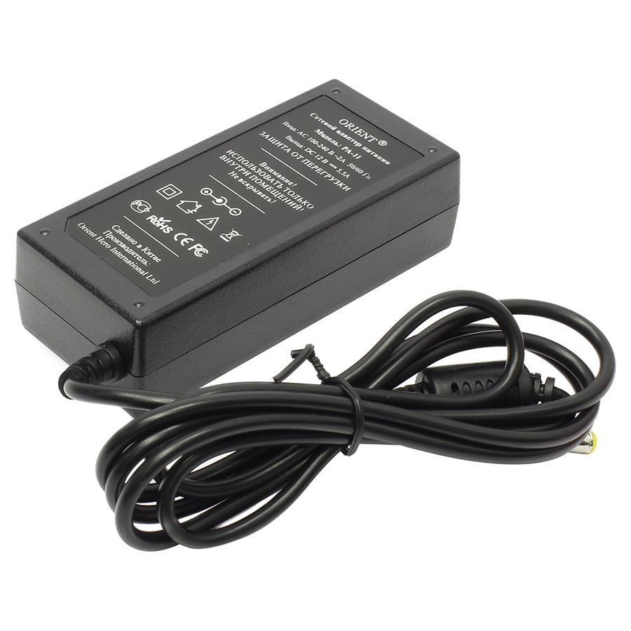 Стабилизированный адаптер питания Orient PA-11 используется для питания систем видеонаблюдения и безопасности, LED устройств и других приборов с напряжением питания 12В и потребляемым током до 5.5А. В нем предусмотрена защита от перегрузки. Оснащен штекером 5.5 х 2.1 мм с положительной полярностью (+).