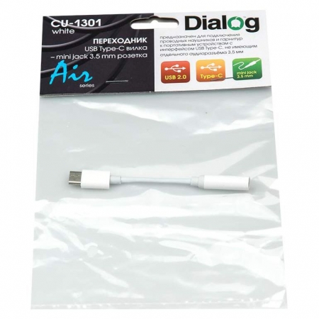 Кабель-адаптер Dialog CU-1301 предназначен для подключения наушников или колонок со стандартным 3.5 миниджеком к смартфону, имеющему разъём USB Type-C.
