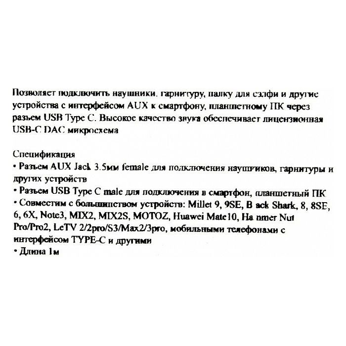 Производитель: KS-is Наименование: Кабель-адаптер Разъемы: Type C(m) - 3,5 plug Совместимость: Совместим с большинством устройств смартфонов, планшетных ПК, мобильными телефонами с интерфейсом USB-C: Millet 9, 9SE, Black Shark, 8, 8SE, 6, 6X, Note3, MIX2, MIX2S, MOTOZ, Huawei Mate10, Hammer Nut Pro/Pro2, LeTV 2/2pro/S3/Max2/3pro, мобильными телефонами с интерфейсом TYPE-C и другими Длина: 1 м Цвет: Белый Размеры упаковки: 20.7 x 13 x 0.8 см Вес: 11 г Вес с упаковкой: 17 г