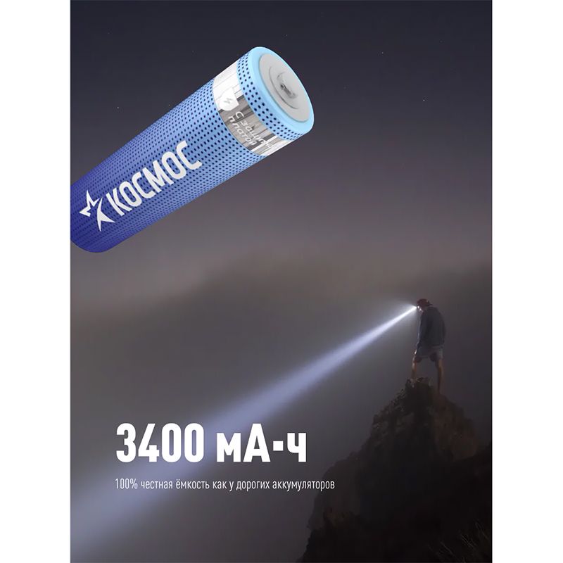 Литий-ионный аккумулятор 18650 Космос 3400 мАч со встроенной защитной платой, предохраняющей от чрезмерного перезаряда/разряда, который может испортить или снизить ёмкость аккумулятора. Идеально подходит для фонарей на сменных аккумуляторах.