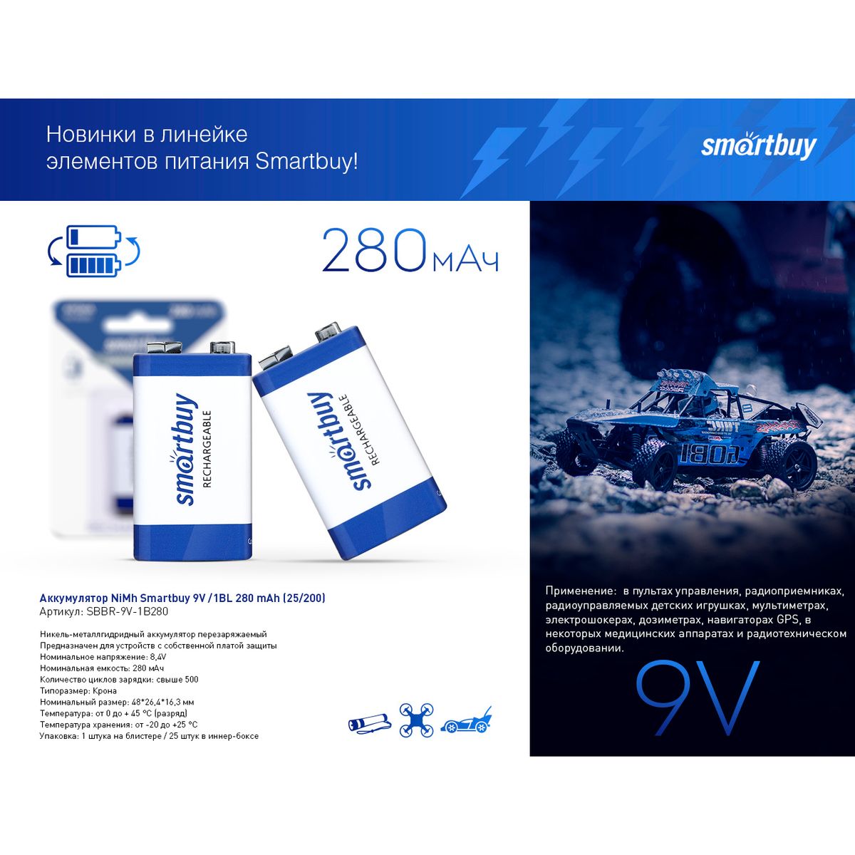 Никель-металлгидридный аккумулятор 9V Smartbuy 280 мАч применяется в пультах управления, радиоприемниках, радиоуправляемых детских игрушках, мультиметрах, электрошокерах, дозиметрах, навигаторах GPS, в медицинском и радиотехническом оборудовании.