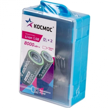 Литий-ионный аккумулятор типа D (R20) с зарядкой от USB. Аккумуляторы рекомендованы для длительного и интенсивного использования. Они накапливают заряд быстрее и больше обычных аккумуляторов, отличаются низким саморазрядом, в них отсутствует «эффект памяти». Аккумуляторы имеют защиту от перезаряда, разряда и перегрузок. Ресурс работы более 1000 циклов перезарядки. В комплект входят 2 аккумулятора емкостью 5300 мАч (8000 мВт*ч) и USB-кабель для зарядки. Технические характеристики