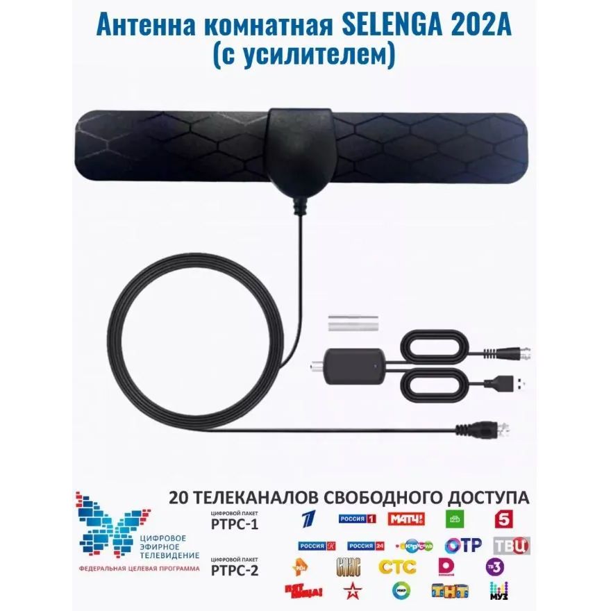 Комнатная активная антенна Selenga 202A предназначена для приема телевизионных программ в полосе частот 174-240 и 470-862МГц. Антенна принимает сигналы аналогового и цифрового телевидения формата DTV-T/DTV-T2. Она оснащена встроенным усилителем сигнала и имеет высокое усиление сигнала (25 дБи), что позволяет её использовать на удалении до 10-25 км от базовой станции. Отличается инновационным дизайном и тонким корпусом. Антенна легко крепится на стекло, заднюю панель телевизора или другую гладкую поверхность. Компактные размеры, малый вес и простая установка обеспечивают удобство использования антенны.