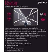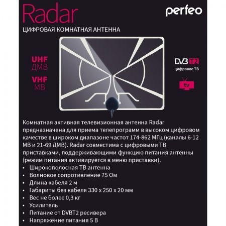 Широкополосная комнатная антенна Perfeo Radar предназначена для приема телевизионных программ в диапазоне частот 174..862 МГц (каналы 6-12 МВ и 21-69 ДМВ), а также приема аналогового и цифрового телевидения формата DVB-T и DVB-T2. Благодаря встроенному усилителю антенна обеспечивает уверенный прием ослабленного сигнала. Питание антенны осуществляется от ТВ-приставки (ресивера), поддерживающей функцию питания антенны (режим питания активируется в меню приставки). Антенна крепится на любую гладкую поверхность с помощью двустороннего скотча.