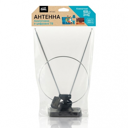 Комнатная пассивная антенна GAL AR-002 предназначена для приёма аналогового и цифрового телевизионного сигнала или радиосигнала FM-диапазона. Устройство имеет телескопические усы (диполи) и антенну типа "Кольцо". Распознаёт различные цифровые HDTV-стандарты эфирного телевещания (DVB-T / DVB-T2 / ISDB-T / DMB-T/H / ATSC) и радио (FM / DAB).