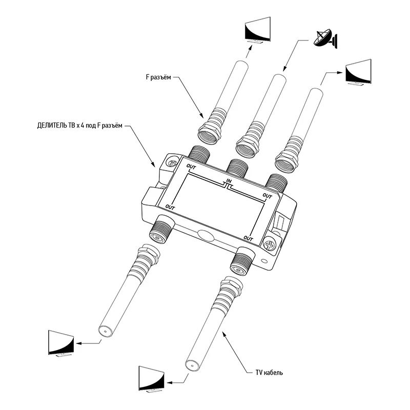 загородных домах. Делитель имеет один вход и четыре выхода, оснащенных F