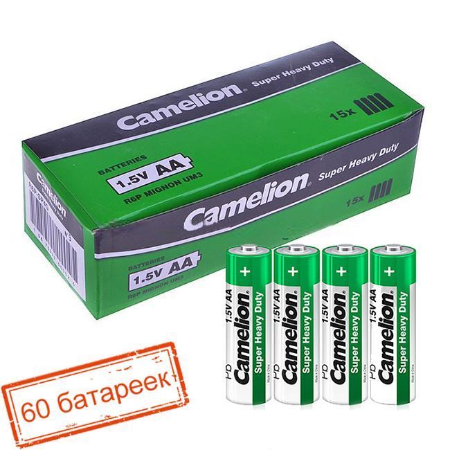 Производитель: Camelion Наименование: Элемент питания Размер: AA (R6) Химический состав: Солевой Напряжение: 1.5 В Упаковка: Термопленка Количество: 60 шт