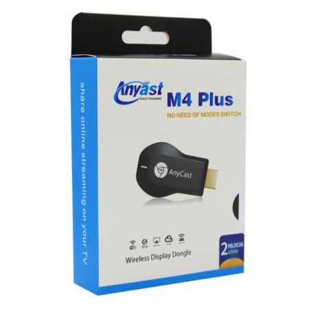 Anycast M4 Plus - беспроводной HDMI адаптер для телевизора. С его помощью вы можете смотреть смотреть любое видео или фотографии со смартфона, планшета или ноутбука на экране телевизоре. Также адаптер позволяет прослушивать музыку, просматривать документы и странички в сети. Адаптер поддерживает протоколы Mircast, Airplay, DLNA и совместим с ОС Windows/iOS/Android. Подключается к мобильному устройству через WiFi соединение. Для соединения адаптера с телевизором используется интерфейс высокого разрешения HDMI и USB-порт для питания.