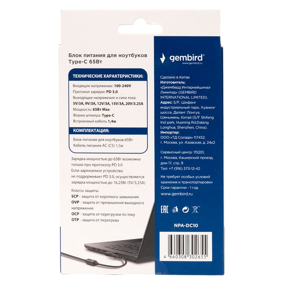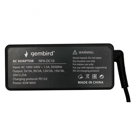 Производитель: Gembird Наименование: Блок питания Входное напряжение: 100-240В Выходное напряжение: 5 В / 3 A, 9 В / 3 A, 12 В / 3 A, 15 В / 3 A, 20 В / 3.25 A Максимальная выходная мощность: 65 Вт Поддержка быстрой зарядки: PD 3.0/PD2.0/PD Разъем питания: кабель Type C Защита: от короткого замыкания, от превышения выходного напряжения, от перегрузки по току, от перегрева Длина кабеля: 1.4 м (встроенный) + 1.5 м (съемный) Материал корпуса: ABS-пластик Цвет: Чёрный