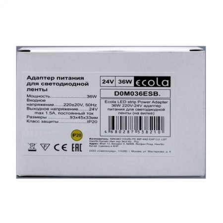 Производитель: Ecola Наименование: Блок питания для светодиодной ленты Входное напряжение: AC 200-240 В 50/60 Гц Выходное напряжение: DC 24 В Макс. мощность: 36 Вт Макс. выходной ток: 1.5А Разъем: Штекер 5.5x2.5 мм. (подходит под разъём 5.5x2.1 мм) Длина кабеля: 90 см Материал корпуса: Пластик Размеры: 93x45x33 мм Упаковка: Коробка