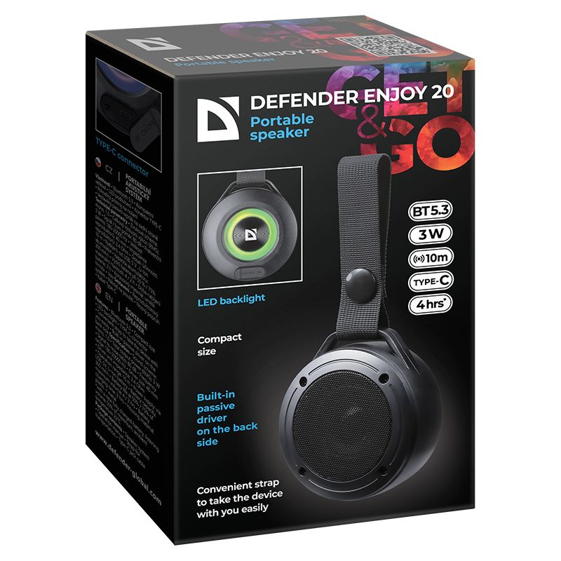 Defender Enjoy 20 - компактная портативная акустическая Bluetooth колонка с LED подсветкой. Встроенный пассивный излучатель на задней панели обеспечивает улучшение качества воспроизведения, усиливает басы и глубину звука. Колонка имеет удобный подвес для переноски. Технические характеристики