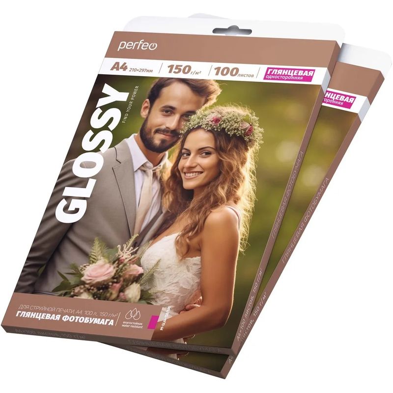Односторонняя глянцевая водостойкая фотобумага Perfeo для струйной печати, A4, 150 г/м2, 100 листов.