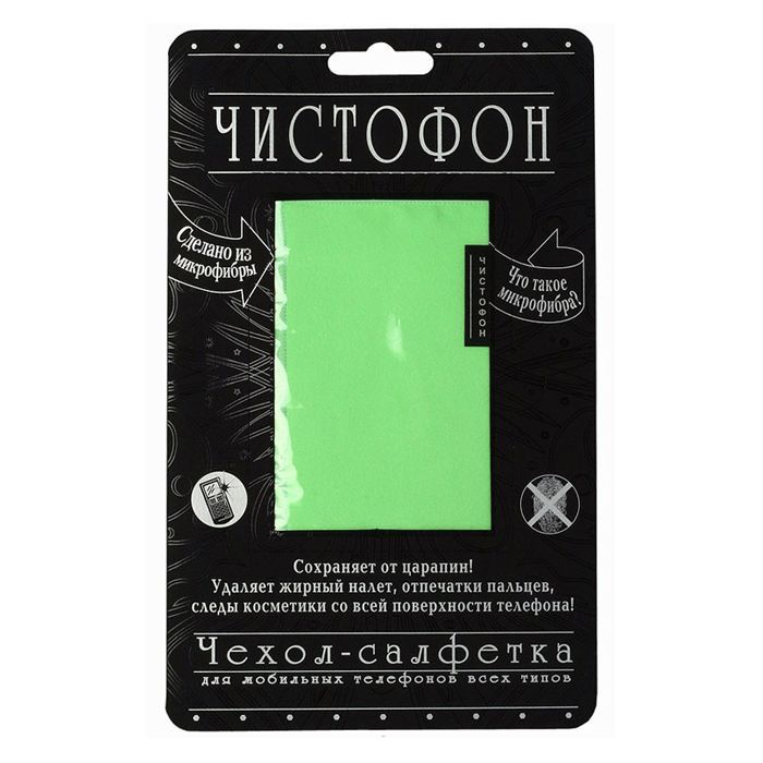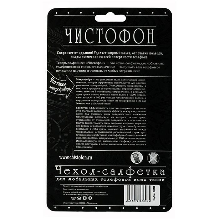 Чистофон - чехол-салфетка для мобильных телефонов всех типов. Чехол изготовлен из мягкого безворсового материала - микрофибры. Этот материал не только предохраняет телефон от образования царапин, но и эффективно удаляет отпечатки пальцев, пыль и другие загрязнения. Чехол-салфетка из микрофибры обладает высокой износостойкостью, он выдерживают до 2000 циклов истирания. Загрязненный чехол достаточно просто постирать, а после высыхания он снова готов к применению!