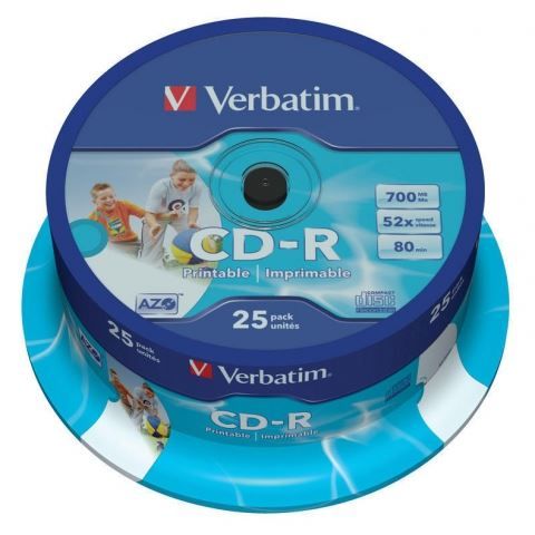 Оптический записываемый диск CD-R Verbatim Printable 700Мб AZO 52x с поверхностью для струйной печати, на шпинеделе, в упаковке 25 штук.