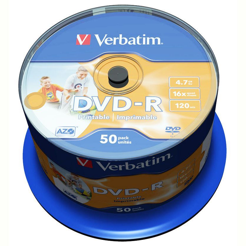 Оптический записываемый диск DVD-R Verbatim Wide Inkjet Printable 4.7Гб 16x с поверхностью для струйной печати, на шпинделе, в упаковке 50 шт.