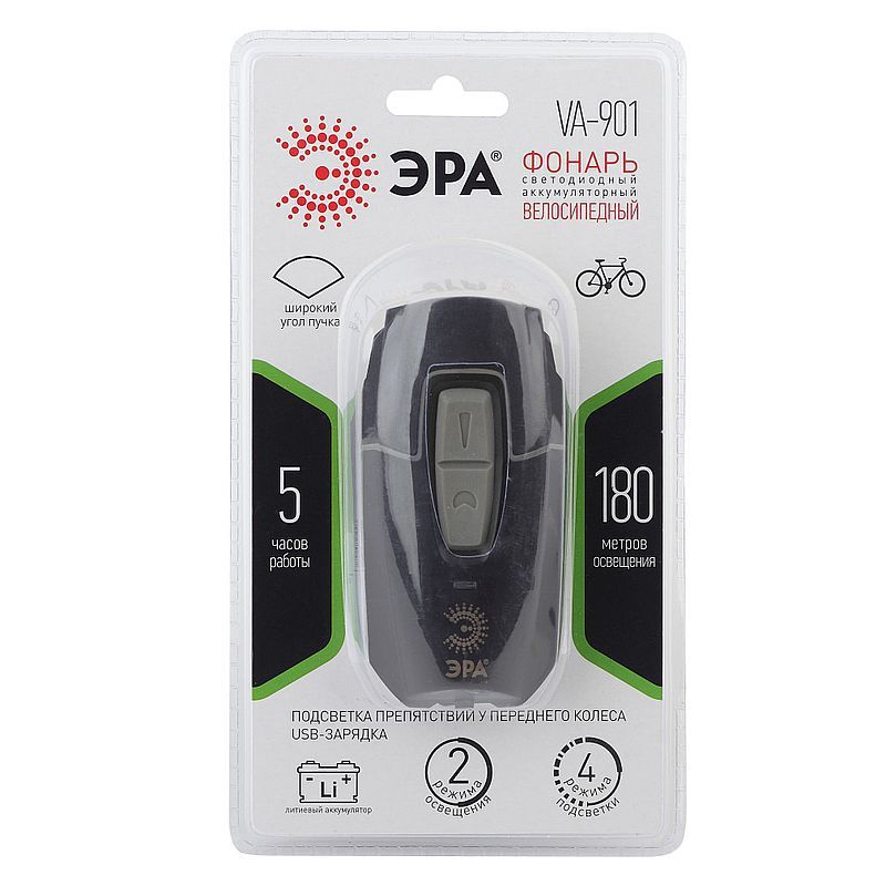 Эра VA-901 - светодиодный велосипедный фонарь на емком литиевом аккумуляторе. Не требует батареек и удобно заряжается от USB. От одной подзарядки работает свыше 5 активных часов благодаря емкому литиевому аккумулятору. Два режима освещения и 4 режима подсветки. Высокая дальность освещения и широкий угол светового пучка. В комплекте с прочным велосипедным фонарем поставляется надежное крепление и провод Micro USB для подзарядки. Провод универсальный - подходит для заряда любых мобильных гаджетов с аналогичным разъемом. С таким помощником можно кататься всю летнюю ночь напролет - литиевый аккумулятор отлично держит заряд. Предусмотрены целых 6 режимов освещения для разных ситуаций. В пути отлично подойдет направленный луч с высокой дальностью - почти 200 метров. Во время остановок лучше переключиться на режим светильника, обеспечив на вечернем пикнике широкий свет, заливающий все вокруг. Этот же режим хорошо подсвечивает препятствия у переднего колеса во время движения. Режимы можно комбинировать. А также менять яркость в зависимости от ситуации - от максимально яркого света до эконом-режима. В нештатной ситуации оперативно включается аварийный режим мигания.