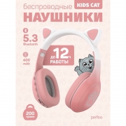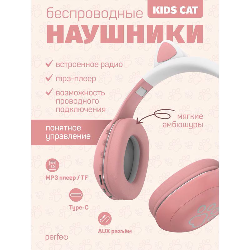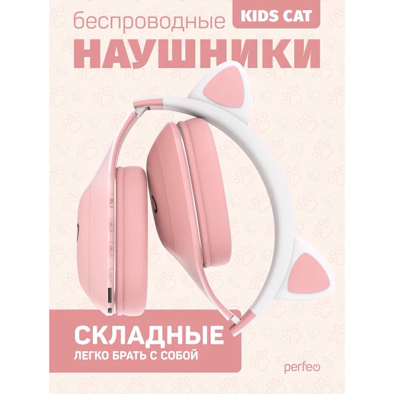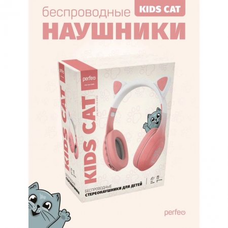 Perfeo KIDS CAT - красивые детские беспроводные наушники с подсветкой, встроенным MP3-плеером и FM-радио. Наушники отличаются небольшим весом (200 г) и имеют складную конструкцию. Светящиеся ушки с разноцветной подсветкой отлично украсят голову ребенка. При необходимости подсветку можно отключить. Регулируемое оголовье и кожаные мягкие амбушюры обеспечивают комфортное ношение в течение длительного времени. Общее время работы наушников от батареи до 12 часов. Предусмотренный AUX-разъём позволяет подключать наушники к устройствам с помощью кабеля.