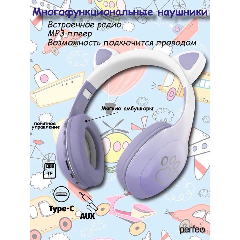 Perfeo KIDS CAT - красивые детские беспроводные наушники с подсветкой,
