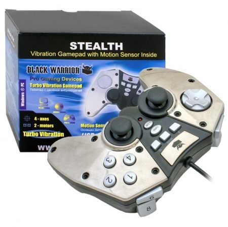 Black Warrior BW-371 Stealth - игровой геймпад для ПК с датчиком движения невероятно расширит ваши возможности. Модель оснащена 12 программируемыми кнопками, поддерживающие turbo-режим. Цифровой D-пад, который находится в левой части геймпада, обеспечивает управление по 8-ми направлениям. Обратная связь Force Vibration благодаря двум вибромоторам с программно-управляемой интенсивностью вибрации обеспечивает высокую реалистичность во время игры. Два аналоговых министика специально спроектированы для игр с полётами и имеют также функции кнопок 11 и 12. LED-индикация отражает активный режим. Необычная форма корпуса с металлическим покрытием придаёт геймпаду сходство с фантастическим летательным аппаратом. Технические характеристики