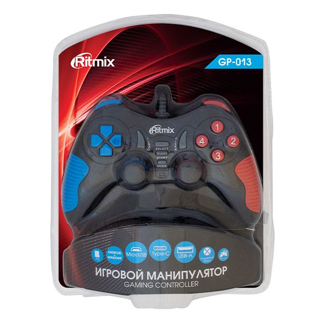 Ritmix GP-013 - проводной игровой манипулятор для персональных компьютеров, ноутбуков и смартфонов на базе Android 5.0** и выше. Оснащён двумя аналоговыми стиками и функцией виброотдачи. В комплекте 2 кабеля-переходника на MicroUSB и USB Type-C.