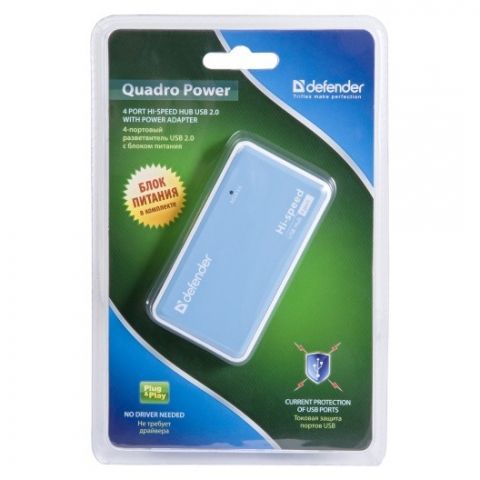 Главная / Комплектующие, периферия / USB разветвители / HUB 4-port Defender Quadro Power USB 2.0 с блоком питания (83503)