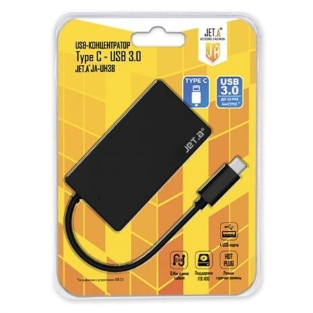 USB-хаб Jet.A JA-UH38 создан для использования с современными ультрабуками, которые зачастую не имеют встроенных USB-портов. Модель JA-UH38 позволяет подключать необходимые внешние устройства мышь, клавиатуру, кабель зарядки для гаджетов, различные носители информации. Интерфейс Type С - USB 3.0 обеспечивает экстремально высокую скорость передачи данных до 5Гб/с, что сокращает время записи и чтения файлов в несколько раз по сравнению с USB 2.0. Также модель JA-UH38 поддерживает подключение внешних жестких дисков емкостью свыше 1ТВ.