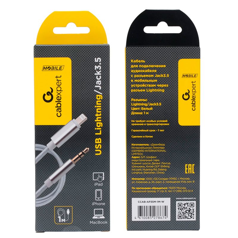 Кабель-адаптер Lightning (m) - Jack 3.5 (m), 1 м, белый, коробка, Cablexpert (CCAB-AP35M-1M-W)